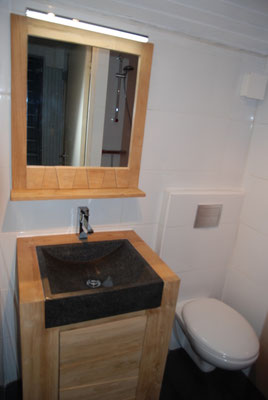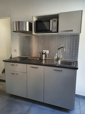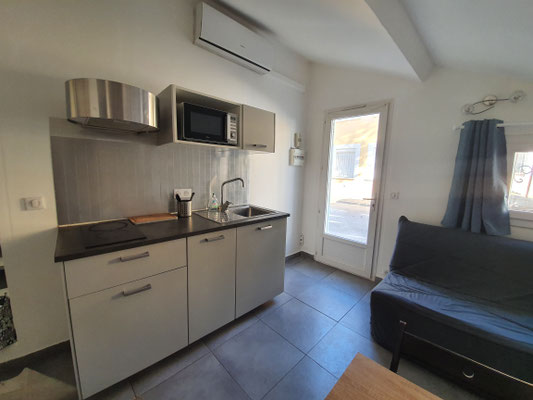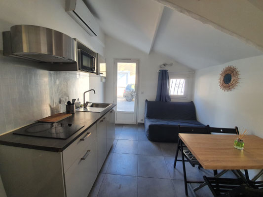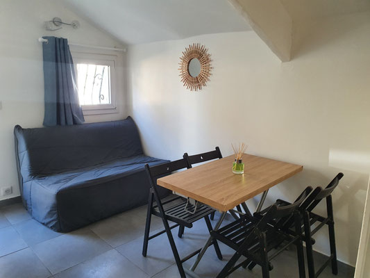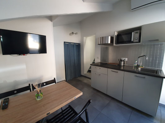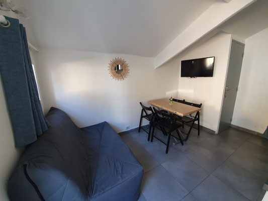Cet appartement en duplex se compose, au rez-de-chaussée, d’un salon / salle à manger avec kitchenette, d’un canapé-lit deux places et d’un placard renfermant la machine à laver. Vous y trouverez également une salle de douche avec toilettes.